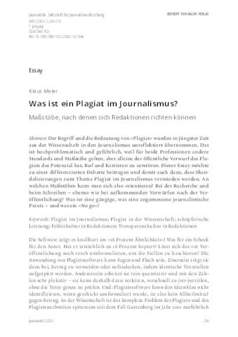 | Schlagwörter: | Plagiat im Journalismus; Plagiat in der Wissenschaft; schöpferische Leistung; Fehlerkultur in Redaktionen; Transparenzkultur in Redaktionen |