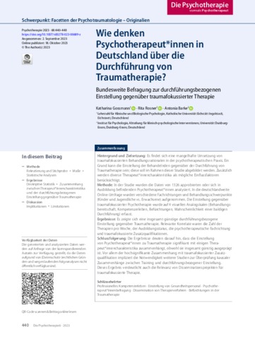Wie denken Psychotherapeut*innen in Deutschland über die Durchführung von Traumatherapie? : bundesweite Befragung zur durchführungsbezogenen Einstellung gegenüber traumafokussierter Therapie.