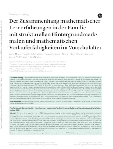 Die familiäre mathematische Lernumwelt (engl. Home Numeracy Environment (HNE)) wirkt als Mediator zwischen strukturellen Hintergrundmerkmalen und frühen mathematischen Vorläuferfähigkeiten. Bislang ist jedoch unklar, ob und inwiefern sich diese Zusammenhänge je nach verwendetem Maß der HNE zeigen. Demnach greift diese Studie vier Maße der HNE auf: die informelle und formelle HNE, die Qualität mathematischer Eltern-Kind-Interaktionen erfasst durch die Beobachtung einer Würfelspielsituation und einen mathematischen Spieltitelrekognitionstest (TRT-Mathe-K). Es wird untersucht, inwiefern diese Maße bei gleichzeitiger Betrachtung miteinander zusammenhängen und den Zusammenhang zwischen dem sozioökonomischen Status (SÖS) und dem Migrationshintergrund mit den kindlichen mathematischen Vorläuferfähigkeiten unterschiedlich vermitteln. Die Ergebnisse zeigen, dass besonders die beobachtete Qualität der Eltern-Kind-Interaktionen während einer Würfelspielsituation sowie ein neues Instrument – der TRT-Mathe-K – mediierende Faktoren im Kontext der untersuchten Hintergrundmerkmale darstellen. Während sich für Familien mit höherem SÖS ein positiver Zusammenhang mit der HNE und den mathematischen Vorläuferfähigkeiten der Kinder fand, wurden für Kinder aus Familien mit Migrationshintergrund negative Zusammenhänge beobachtet. Die Notwendigkeit eines kritisch reflektierten Einsatzes von unterschiedlichen HNE-Maßen für zukünftige Forschung und Implikationen für die Praxis im Kontext struktureller Hintergrundmerkmale wird diskutiert.