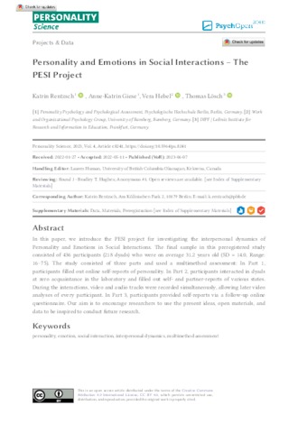 In this paper, we introduce the PESI project for investigating the interpersonal dynamics of Personality and Emotions in Social Interactions. The final sample in this preregistered study consisted of 436 participants (218 dyads) who were on average 31.2 years old (SD = 14.0, Range: 16–75). The study consisted of three parts and used a multimethod assessment: In Part 1, participants filled out online self-reports of personality. In Part 2, participants interacted in dyads at zero acquaintance in the laboratory and filled out self- and partner-reports of various states. During the interactions, video and audio tracks were recorded simultaneously, allowing later video analyses of every participant. In Part 3, participants provided self-reports via a follow-up online questionnaire. Our aim is to encourage researchers to use the present ideas, open materials, and data to be inspired to conduct future research.