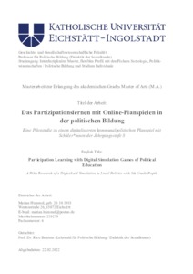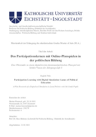 Das Partizipationslernen mit Planspielen in der politischen Bildung : eine Pilotstudie zu einem digitalisierten kommunalpolitischen Planspiel mit Schüler*innen der Jahrgangsstufe 8.