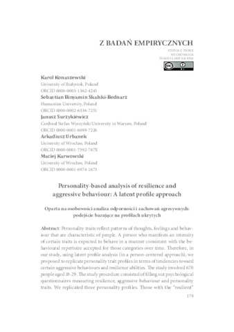 Personality traits reflect patterns of thoughts, feelings and behaviour that are characteristic of people. A person who manifests an intensity of certain traits is expected to behave in a manner consistent with the behavioural repertoire accepted for those categories over time. Therefore, in our study, using latent profile analysis (in a person-centered approach), we proposed to replicate personality trait profiles in terms of tendencies toward certain aggressive behaviours and resilience abilities. The study involved 670 people aged 18-29. The study procedure consisted of filling out psychological questionnaires measuring resilience, aggressive behaviour and personality traits. We replicated three personality profiles. Those with the "resilient" profile scored low on neuroticism and relatively high on conscientiousness, agreeableness and extraversion, in contrast to those with the "overcontrolled" profile, who scored significantly higher on neuroticism and lower on the extraversion domain. The "resilient" profile was characterized by the highest levels of resilience and the lowest levels of aggression. In contrast, the "overcontrolled" profile was characterized by low levels of resilience and high levels of aggression. The "adaptive" profile was the most numerous, with average scores in all Big Five domains and average scores in resilience and aggression. Our study shows that generalizable personality profiles can be identified empirically, and that the unique constellation of traits that define an individual has important implications for a wide range of behaviours including aggressive behaviour and resilience.