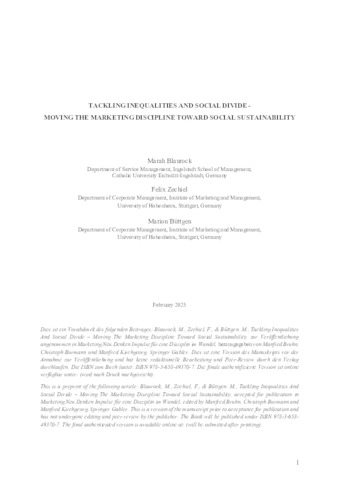 | Zusätzliche Informationen: | Dies ist ein Vorabdruck des folgenden Beitrages: Blaurock, M., Zechiel, F., & Büttgen. M., Tackling Inequalities And Social Divide – Moving The Marketing Discipline Toward Social Sustainability, zur Veröffentlichung angenommen in Marketing.Neu.Denken Impulse für eine Disziplin im Wandel, herausgegeben von Manfred Bruhn, Christoph Burmann und Manfred Kirchgeorg, Springer Gabler. Dies ist eine Version des Manuskripts vor der Annahme zur Veröffentlichung und hat keine redaktionelle Bearbeitung und Peer-Review durch den Verlag durchlaufen. Die ISBN zum Buch lautet: ISBN 978-3-658-49370-7. Die finale authentifizierte Version ist online verfügbar unter: (wird nach Druck nachgereicht). |