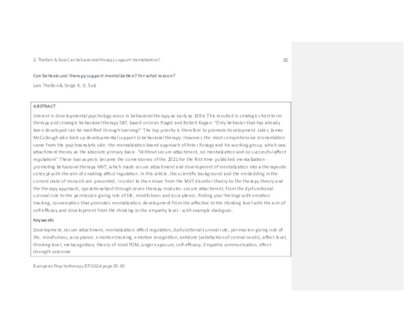 Interest in developmental psychology arose in behavioral therapy as early as 1994. This resulted in strategic short-term therapy and strategic-behavioral therapy SBT, based on Jean Piaget and Robert Kegan: “Only behavior that has already been developed can be modified through learning!” The top priority is therefore to promote development. Later, James McCullough also took up developmental support in behavioral therapy. However, the most comprehensive reorientation came from the psychoanalytic side: the mentalization-based approach of Peter Fonagy and his working group, which saw attachment theory as the absolute primary basis: “Without secure attachment, no mentalization and no successful affect regulation!” These two aspects became the cornerstones of the 2021 for the first time published mentalization-promoting behavioral therapy MVT, which made secure attachment and development of mentalization into a therapeutic concept with the aim of enabling affect regulation. In this article, the scientific background and the embedding in the current state of research are presented, in order to then move from the MVT disorder theory to the therapy theory and the therapy approach, operationalized through seven therapy modules: secure attachment, from the dysfunctional survival rule to the permission-giving rule of life, mindfulness and Acceptance, finding your feelings with emotion tracking, conversation that promotes mentalization, development from the affective to the thinking level with the aim of self-efficacy and development from the thinking to the empathy level - with example dialogues.