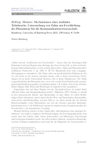 Hellwig, Melanie: Mechanismen eines medialen Tabubruchs : Untersuchung von Tabus zur Erschließung des Phänomens für die Kommunikationswissenschaft. Bamberg, 2021.