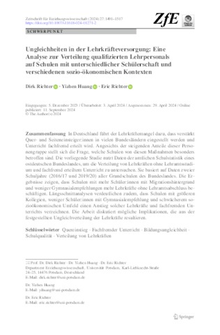 In Deutschland führt der Lehrkräftemangel dazu, dass verstärkt Quer- und Seiteneinsteiger:innen in vielen Bundesländern eingestellt werden und Unterricht fachfremd erteilt wird. Angesichts der steigenden Anteile dieser Personengruppe stellt sich die Frage, welche Schulen von diesen Maßnahmen besonders betroffen sind. Die vorliegende Studie nutzt Daten der amtlichen Schulstatistik eines ostdeutschen Bundeslandes, um die Verteilung von Lehrkräften ohne Lehramtsstudium und fachfremd erteiltem Unterricht zu untersuchen. Sie basiert auf Daten zweier Schuljahre (2016/17 und 2019/20) aller Grundschulen des Bundeslandes. Die Ergebnisse zeigen, dass Schulen mit mehr Schüler:innen mit Migrationshintergrund und weniger Gymnasialempfehlungen mehr Lehrkräfte ohne Lehramtsabschluss beschäftigen. Längsschnittanalysen verdeutlichen zudem, dass Schulen mit größeren Kollegien, weniger Schüler:innen mit Gymnasialempfehlung und schwächerem sozioökonomischen Umfeld einen Anstieg solcher Lehrkräfte und fachfremden Unterrichts verzeichnen. Die Arbeit diskutiert mögliche Implikationen, die aus der festgestellten Ungleichverteilung der Lehrkräfte resultieren.