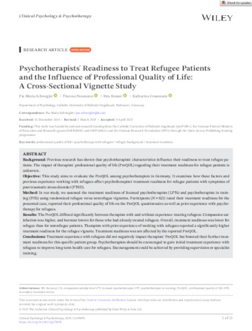 In our study, we assessed the treatment readiness of licensed psychotherapists (LPTs) and psychotherapists in training (PiTs) using randomized refugee verus nonrefugee vignettes. Participants ( N = 821) rated their treatment readiness for the presented case, reported their professional quality of life on the ProQOL questionnaire as well as prior experience with psychotherapy for refugees.