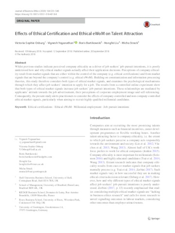 Effects of Ethical Certification and Ethical eWoM on Talent Attraction.