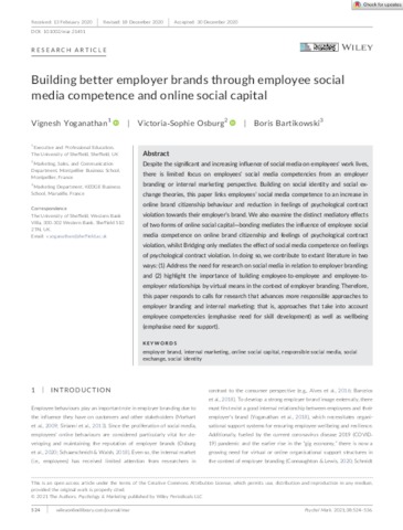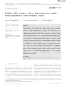 Despite the significant and increasing influence of social media on employees' work lives, there is limited focus on employees' social media competencies from an employer branding or internal marketing perspective. Building on social identity and social exchange theories, this paper links employees' social media competence to an increase in online brand citizenship behaviour and reduction in feelings of psychological contract violation towards their employer's brand. We also examine the distinct mediatory effects of two forms of online social capital—bonding mediates the influence of employee social media competence on online brand citizenship and feelings of psychological contract violation, whilst Bridging only mediates the effect of social media competence on feelings of psychological contract violation. In doing so, we contribute to extant literature in two ways: (1) Address the need for research on social media in relation to employer branding; and (2) highlight the importance of building employee‐to‐employee and employee‐to‐employer relationships by virtual means in the context of employer branding. Therefore, this paper responds to calls for research that advances more responsible approaches to employer branding and internal marketing; that is, approaches that take into account employee competencies (emphasise need for skill development) as well as wellbeing (emphasise need for support).