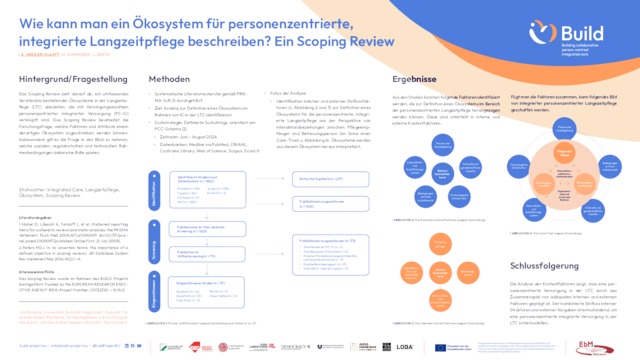 Das Scoping Review zeigt, dass sich Ökosysteme für personenzentrierte, integrierte Langzeitpflege in vielfältigen Kontextfaktoren darstellen lassen. Zentrale interne Faktoren umfassen die organisatorischen und strukturellen Rahmenbedingungen sowie die technischen und digitalen Infrastrukturen. Externe Faktoren beinhalten regulatorische Vorgaben innerhalb und außerhalb des Gesundheitswesens, die Marktbedingungen sowie gesellschaftliche Normen und soziale Versorgungssysteme. Die vorläufigen Ergebnisse verdeutlichen außerdem die Bedeutung von interdisziplinärer Zusammenarbeit unter Berücksichtigung der unterschiedlichen Perspektiven der Pflegeempfänger sowie der formell und informell Pflegenden.