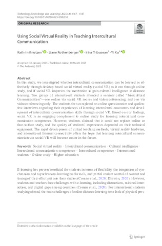 In this study, we investigated whether intercultural communication can be learned as effectively through desktop-based social virtual reality (social VR) as it can through online study, and if social VR improves the motivation to gain cultural intelligence in distance learning. Two groups of international students attended a seminar called “Intercultural Communication”—one online via social VR rooms and videoconferencing, and one via videoconferencing only. The students then completed an online questionnaire and qualitative interviews regarding their experiences of learning intercultural encounters and development of intercultural communication skills through social VR. Based on our findings, social VR is an engaging complement to online study for learning intercultural communication competence. However, students claimed that it could not replace online or face-to-face study, and the quality of students’ experiences depended on their technical equipment. The rapid development of virtual teaching methods, virtual reality hardware, and international Internet connectivity offers the hope that learning intercultural communication via social VR will become easier in the future.