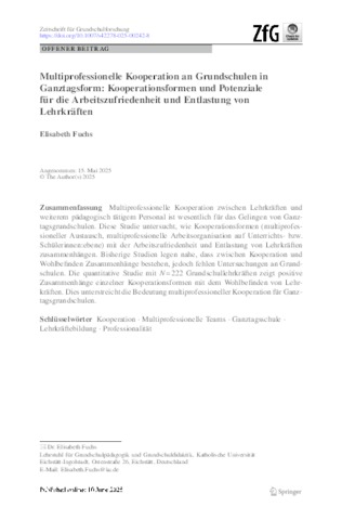 Multiprofessionelle Kooperation zwischen Lehrkräften und weiterem pädagogisch tätigem Personal ist wesentlich für das Gelingen von Ganztagsgrundschulen. Diese Studie untersucht, wie Kooperationsformen (multiprofessioneller Austausch, multiprofessionelle Arbeitsorganisation auf Unterrichts- bzw. Schülerinnen:ebene) mit der Arbeitszufriedenheit und Entlastung von Lehrkräften zusammenhängen. Bisherige Studien legen nahe, dass zwischen Kooperation und Wohlbefinden Zusammenhänge bestehen, jedoch fehlen Untersuchungen an Grundschulen. Die quantitative Studie mit N = 222 Grundschullehrkräften zeigt positive Zusammenhänge einzelner Kooperationsformen mit dem Wohlbefinden von Lehrkräften. Dies unterstreicht die Bedeutung multiprofessioneller Kooperation für Ganztagsgrundschulen.