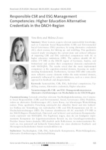 Lernende erwerben relevante Nachhaltigkeitskenntnisse, wie Corporate Social Responsibility (CSR) und Environmental, Social, Governance (ESG) Praktiken, indem sie alternative Zertifizierungen (AC), kurze Kurse, zur lebenslangen Weiterbildung nutzen. Diese qualitative Forschung untersucht den aktuellen Stand und den kulturellen Einfluss der Vermittlung von individuellen CSR- und ESG-Kompetenzen mit AC in Hochschuleinrichtungen (HEI). Die Autoren identifizieren 68 AC innerhalb 179 HEI in der DACH-Region (Deutschland, Österreich und Schweiz) und analysieren Kompetenzbereiche explorativ mit MAXQDA. Die Ergebnisse zeigen, dass die am häufigsten implementierte Kompetenz der kognitionsorientierte Bereich ist, das Grundlagenverständnis. Darüber hinaus bieten deutsche HEI deutlich mehr Reflexionen im metaorientierten Bereich an, was potenziell auf kulturelle Unterschiede wie einen direkteren Feedback- und Meinungsverschiedenheiten-Ansatz zurückzuführen ist.