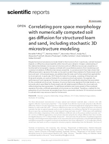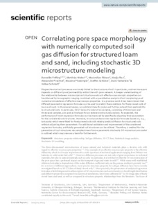 Correlating pore space morphology with numerically computed soil gas diffusion for structured loam and sand, including stochastic 3D microstructure modeling.