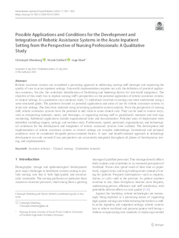 Possible Applications and Conditions for the Development and Integration of Robotic Assistance Systems in the Acute Inpatient Setting from the Perspective of Nursing Professionals : A Qualitative Study.