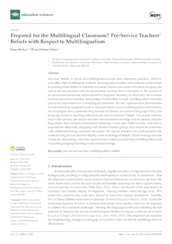 Teachers’ beliefs on issues of multilingualism shape their classroom practices, which in turn affect their multilingual students’ learning opportunities and academic achievement. Examining these beliefs is therefore crucial for teacher educators who strive to equip pre- and in-service teachers with the appropriate mindset that is necessary in the context of an educational landscape characterized by linguistic diversity. In this study, we examine German pre-service teachers’ knowledge of and beliefs toward multilingualism and their perceived preparedness for a multilingual classroom. We use a questionnaire that includes an internationally recognized scale to measure beliefs toward multilingualism Additionally, we investigate how a semester-long lecture on German as a second language (GSL) and language-sensitive teaching influences pre-service teachers’ beliefs. The results indicate that while German pre-service teachers demonstrate knowledge and awareness of multilingualism, there remains potential for fostering a more open belief system—one that is essential for effectively engaging with diverse student groups and should be systematically addressed during university education. Pre-service teachers who participated in the semester-long lecture showed slightly more multilingual beliefs. These findings provide a basis for discussing curricular opportunities aimed at promoting multilingualism and supporting language learning in educational settings.