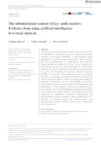 This study provides empirical evidence that key audit matters (KAMs) are informative for future negative accounting outcomes. We employ FinBERT—a deep learning model designed for natural language processing that allows human‐like text comprehension—to demonstrate that goodwill‐related KAMs are predictive of firms' future impairments. Our findings reveal that utilizing KAMs as a stand‐alone predictor for future impairments provides meaningful predictive power. By exploring the semantic content of reported KAMs, we find that their predictive power is primarily driven by text passages covering how both the firm and the auditor exercise judgment in the accounting and auditing of goodwill. Furthermore, we show that KAMs are incrementally predictive beyond several firm‐level determinants and disclosures in annual reports. Finally, our additional analyses indicate that (1) KAM‐predicted impairment probabilities are relevant to capital markets, (2) KAMs are useful for predicting the magnitude of goodwill impairments, and (3) the predictive power extends to other KAM topics. Collectively, our findings enhance the understanding of the informational content of KAMs, which is a key rationale for their introduction.