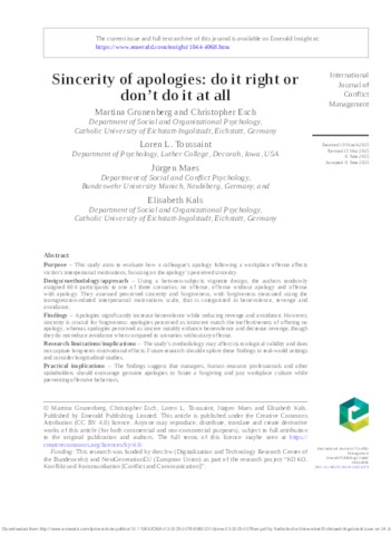 Design/methodology/approach: Using a between-subjects vignette design, the authors randomly assigned 604 participants to one of three scenarios: no offense, offense without apology and offense with apology. They assessed perceived sincerity and forgiveness, with forgiveness measured using the transgression-related interpersonal motivations scale, that is categorized in benevolence, revenge and avoidance.