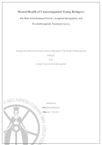 Unaccompanied young refugees (UYRs) are exposed to multiple stressors before, during, and after flight, placing them at heightened risk for mental health disorders such as post-traumatic stress symptoms (PTSS), depression, and anxiety. As UYRs are usually placed in residential group homes in the Child and Youth Welfare System (CYWS) in Germany, it is important to analyze the role of the institutional environment on UYR’s mental health, as well as the symptom recognition and agreement with their caregivers concerning the symptomatology and how psychotherapeutic treatment can be facilitated. This dissertation synthesizes findings from three publications examining these research questions.
