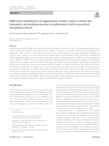 Differential contributions of approximate number system, number line estimation, and working memory to mathematical skills in preschool and primary school.