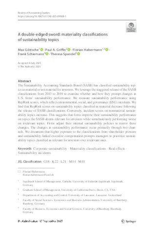 The Sustainability Accounting Standards Board (SASB) has classified sustainability topics as material or not material for investors. We leverage the staggered release of the SASB classifications from 2013 to 2016 to examine whether and how they prompt changes in U.S. firms’ sustainability performance. We measure sustainability performance using RepRisk scores, which reflect environmental, social, and governance (ESG) incidents. We find that RepRisk scores on sustainability topics classified as material decrease following the release of SASB classifications. Conversely, incident scores on nonmaterial sustainability topics increase. This suggests that firms improve their sustainability performance on topics the SASB deems relevant for investors while simultaneously performing worse on irrelevant topics. Firms adjust their internal sustainability policies to mirror these changes. The changes in sustainability performance occur primarily through two channels. We document that higher exposure to the classifications from shareholder pressure and sustainability-linked executive compensation prompts managers to prioritize sustainability topics classified as relevant for investors over irrelevant ones.