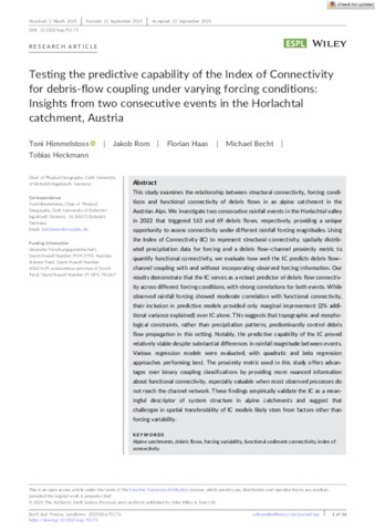 Testing the predictive capability of the Index of Connectivity for debris‐flow coupling under varying forcing conditions : Insights from two consecutive events in the Horlachtal catchment, Austria.