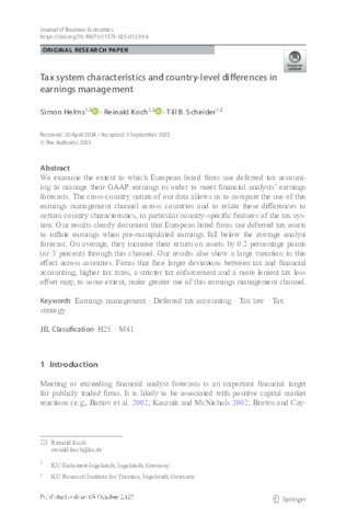 We examine the extent to which European listed firms use deferred tax accounting to manage their GAAP earnings in order to meet financial analysts’ earnings forecasts. The cross-country nature of our data allows us to compare the use of this earnings management channel across countries and to relate these differences to certain country characteristics, in particular country-specific features of the tax system. Our results clearly document that European listed firms use deferred tax assets to inflate earnings when pre-manipulated earnings fall below the average analyst forecast. On average, they increase their return on assets by 0.2 percentage points (or 3 percent) through this channel. Our results also show a large variation in this effect across countries. Firms that face larger deviations between tax and financial accounting, higher tax rates, a stricter tax enforcement and a more lenient tax loss offset may, to some extent, make greater use of this earnings management channel.