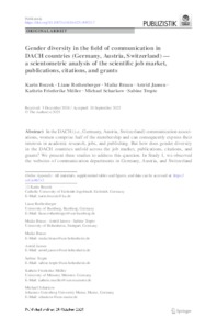 Gender diversity in the field of communication in DACH countries (Germany, Austria, Switzerland) : a scientometric analysis of the scientific job market, publications, citations, and grants.