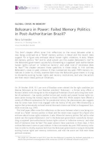 This brief chapter offers some first reflections on the nexus between what is now being construed as a ‘failed’ memory politics in Brazil and the recent mass support for a figure who enthuses about human rights violations. It asks: Where did memory politics ‘fail’ and to what extent can this explain Bolsonaro’s rise? Is the Bolsonaro government successfully dismantling a supposed ‘post-authoritarian human rights culture’ or ‘collective memory’, and what kind of resistance does he face? The chapter answers these questions in three steps. It first outlines Bolsonaro’s views on past violence. It then summarises key post-1985 memory initiatives in order to, thirdly, examine both how the Bolsonaro government is trying to dismantle existing human rights and memory institutions, and who the actors are that resist these political initiatives.
