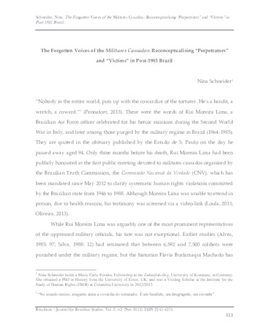 The Forgotten Voices of the Militares Cassados in Brazil : Reconceptualising "Perpetrators" and "Victims" in Post-1985 Brazil.