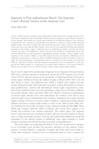 Impunity in Post-authoritarian Brazil : The Supreme Court’s Recent Verdict on the Amnesty Law.
