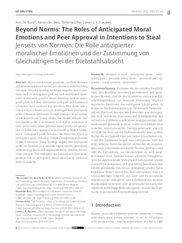 Probleme der moralischen Verpflichtung, also Konflikte zwischen Eigeninteresse und moralischen Normen, sind für das Verständnis antisozialer Entscheidungsfindung von zentraler Bedeutung. Negative moralische Emotionen wie antizipierte Schuld gelten als etablierte Abschreckungsfaktoren für deviante Verhaltensweisen. Positiven moralischen Emotionen wie antizipiertem Stolz und deren Interaktion mit Schuldgefühlen und normativen Einflüssen wurde bisher hingegen weniger Aufmerksamkeit geschenkt. In dieser Studie wird mithilfe einer visuellen, szenariobasierten Umfrage untersucht, wie sich antizipierter Stolz auf die Diebstahlsabsicht einer großen Stichprobe von Jugendlichen und jungen Erwachsenen auswirkt. Die Ergebnisse zeigen, dass antizipierter Stolz mit einer höheren Diebstahlsabsicht verbunden ist, insbesondere, wenn persönliche moralische Normen permissiv sind oder die Zustimmung von Gleichaltrigen als hoch wahrgenommen wird. Darüber hinaus schwächt antizipierter Stolz die abschreckende Wirkung von antizipierter Schuld,