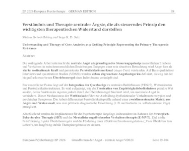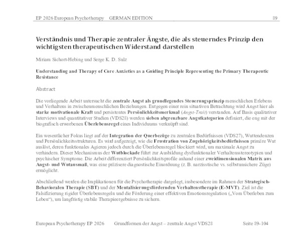 | Schlagwörter: | Zentrale Angst (VDS28; Überlebensregel; Persönlichkeitsmerkmale (Angst-Traits); Zentrale Bedürfnisse (VDS27); Wutblockade; Symptomentstehung; Strategisch-Behaviorale Therapie (SBT); Emotions- und Mentalisierungsfördernde Verhaltenstherapie E-E-MVT; Emotionsregulation |