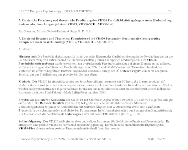 Schlussfolgerung: Der VDS30 stellt ein reliables und valides Instrument für die klinische Praxis und Forschung dar. Er ermöglicht eine präzise Funktionsanalyse und Behandlungsplanung. Durch die ressourcenorientierte Ergänzung des VDS19-Plus können zudem positive Therapieziele individuell formuliert werden.