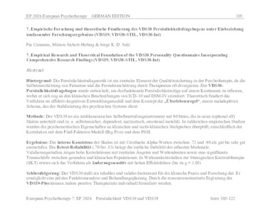 Methode: Der VDS30 ist ein zeitökonomisches Selbstbeurteilungsinstrument mit 90 Items, die in neun (optional elf) Skalen unterteilt sind (u. a. selbstunsicher, dependent, narzisstisch, emotional instabil). In zahlreichen empirischen Studien wurden die psychometrischen Eigenschaften an klinischen und nicht-klinischen Stichproben überprüft, einschließlich der Korrelation mit dem Fünf-Faktoren-Modell (Big Five) und dem PSSI.