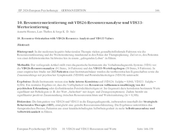 | Schlagwörter: | VDS26 (Ressourcenanalyse); VDS33 (Werteanalyse); Ressourcenorientierung; Wertorientierung; Strategisch-Behaviorale Therapie (SBT); Eingangsdiagnostik; Selbsttranszendenz; Psychotherapie-Planung; Ressourcenutilisierung; Verhaltensdiagnostik-System (VDS); Selbstwirksamkeit; Gelingendes Leben |