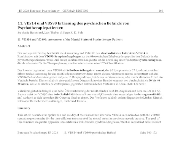 | Schlagwörter: | Psychischer Befund; VDS14-Befund; VDS90-Symptomliste; Syndromdiagnostik; Zeitökonomie;